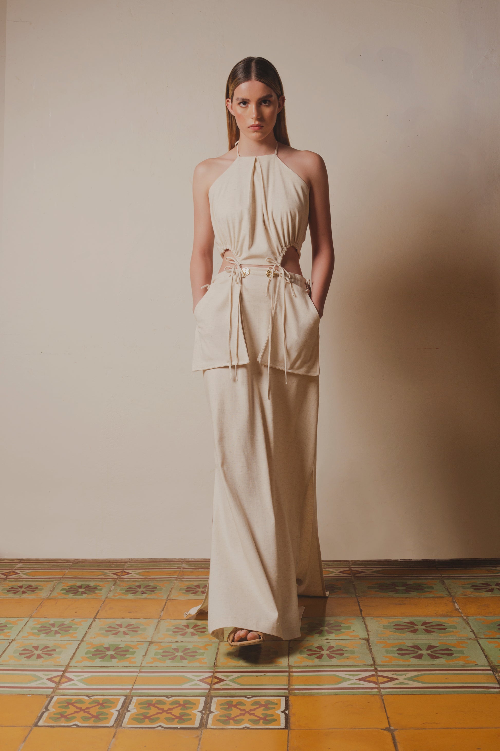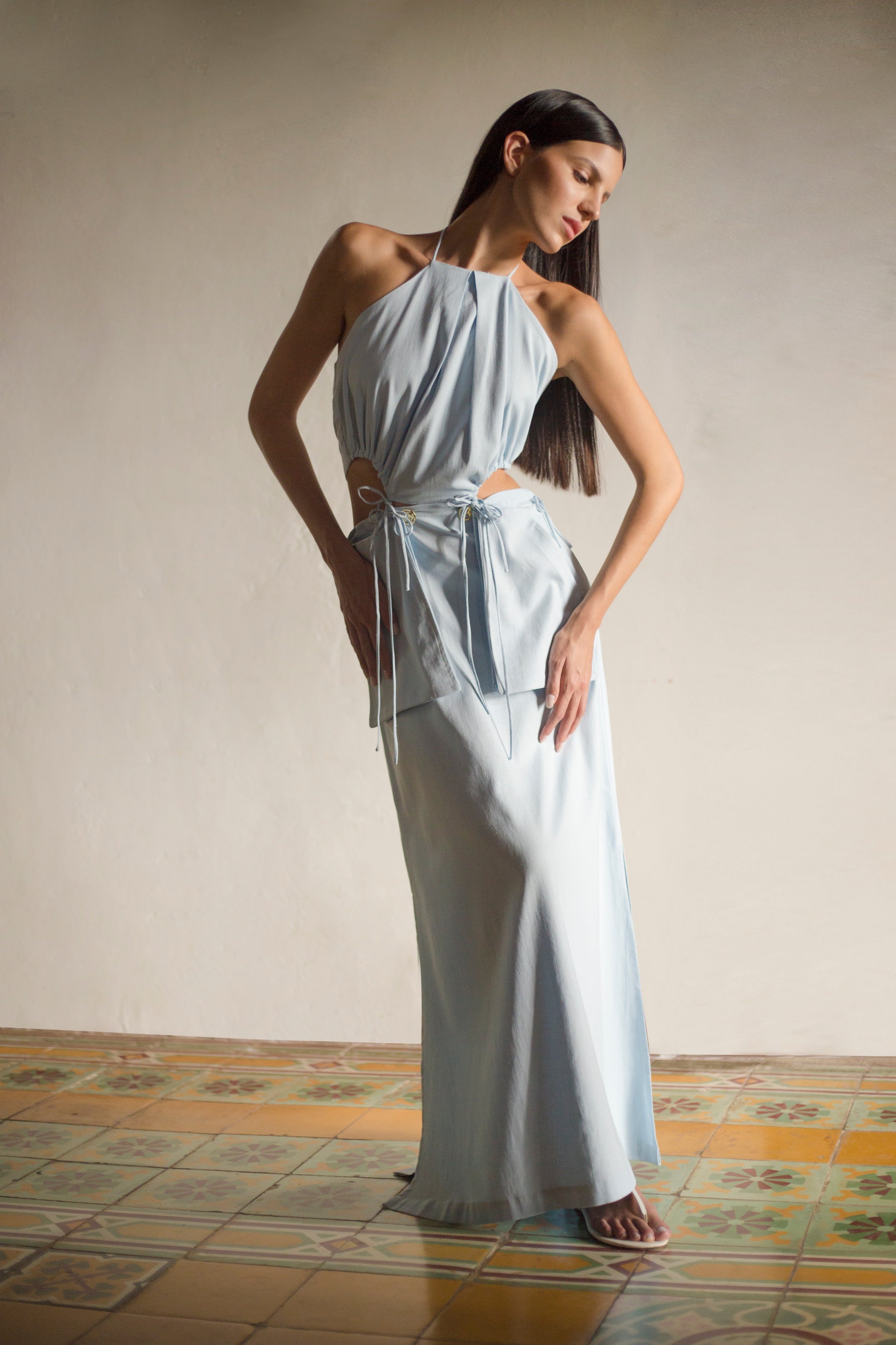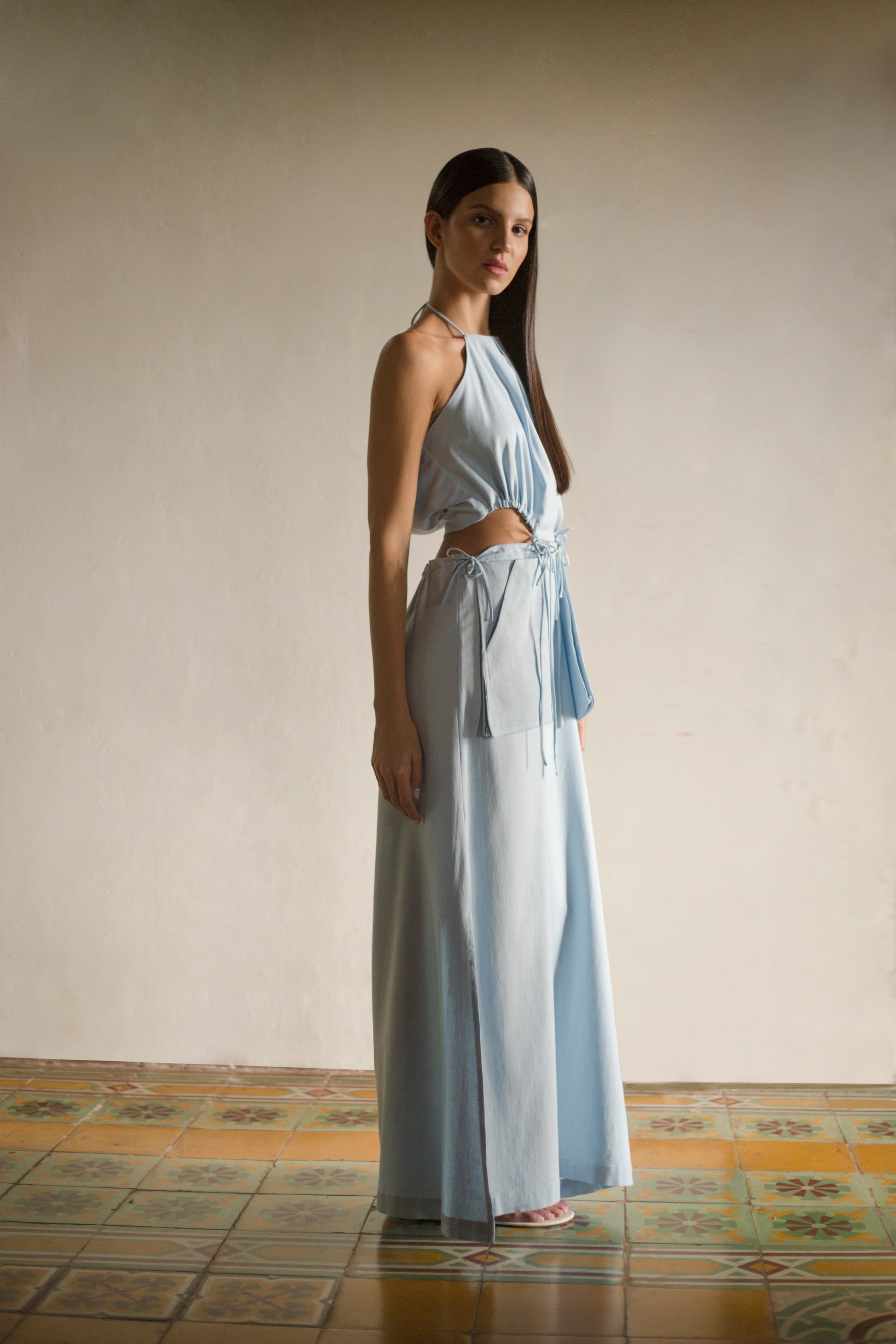El vestido 'Mono Ardilla' está confeccionado en lino ligero y fluido, con detalles de cortes laterales y bolsillos removibles, lo que lo convierte en un básico de verano perfecto para vacaciones o fiestas al aire libre. El vestido tiene un escote halter pronunciado sostenido con delicados tirantes y un ajuste ceñido a la figura que se puede modificar usando los lazos y separando la parte superior de la falda. Cuando estés en frente de la cámara, gira para revelar la espalda abierta.